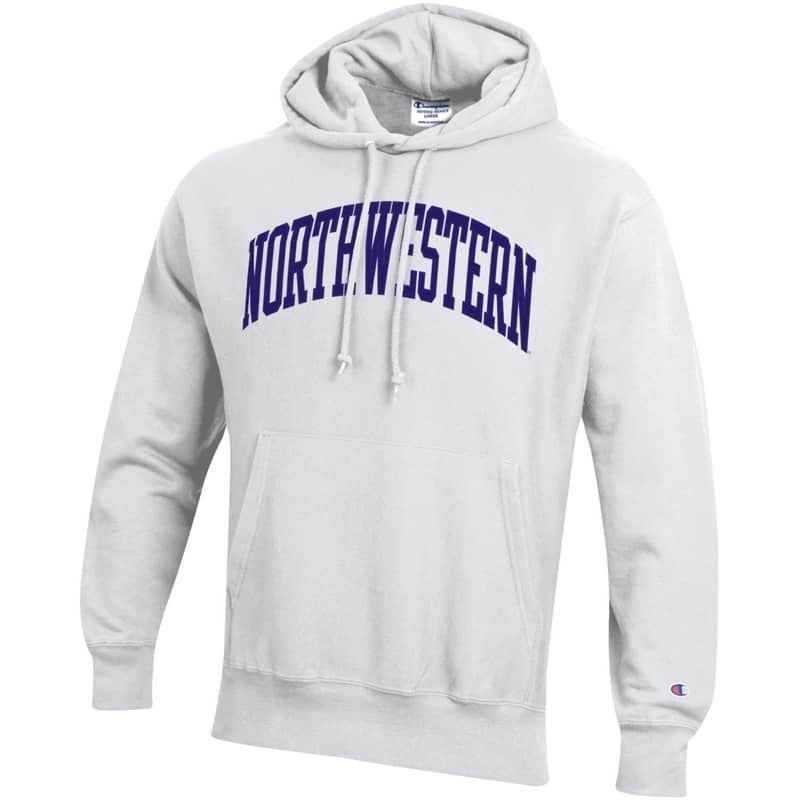Northwestern University Wildcats Men’s White Champion Super Heavy Reverse Weave Hooded Sweatshirt with Purple Arched Northwestern Wool Sewn Appliqué Design