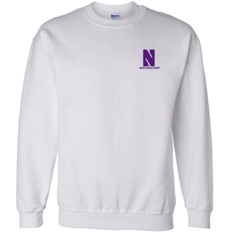Northwestern University Wildcats Men’s White Crewneck Sweatshirt with Left Chest Embroidered Stylized N & Northwestern Design