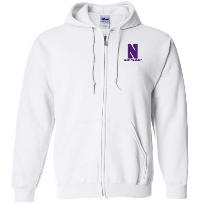 Men’s White Full-Zip Hooded Sweatshirt with Left Chest Embroidered Stylized N & Northwestern Design