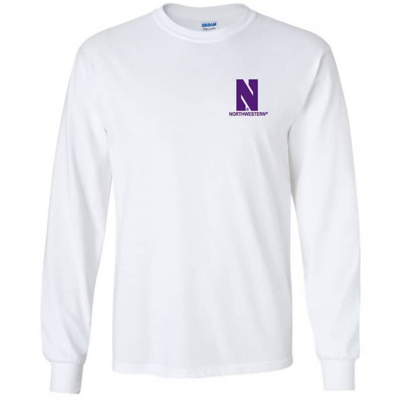 Men’s White Long Sleeve Tee Shirt with Left Chest Embroidered Stylized N & Northwestern Design