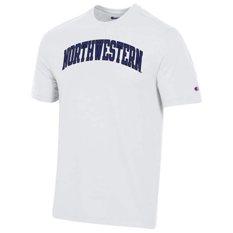 Northwestern University Wildcats Men’s White Short Sleeve Tee Shirt with Vintage Appliqué Arched Northwestern Design
