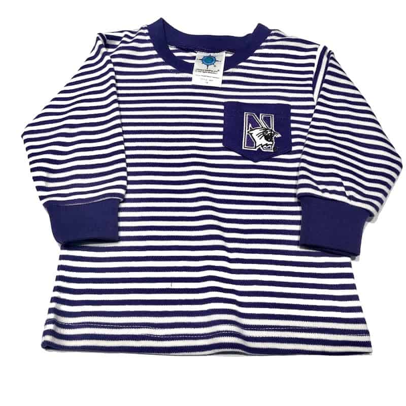 Northwestern University Wildcats Purple & White Stripped Long Sleeve Pocket T-Shirt With Embroidered N-Cat Design