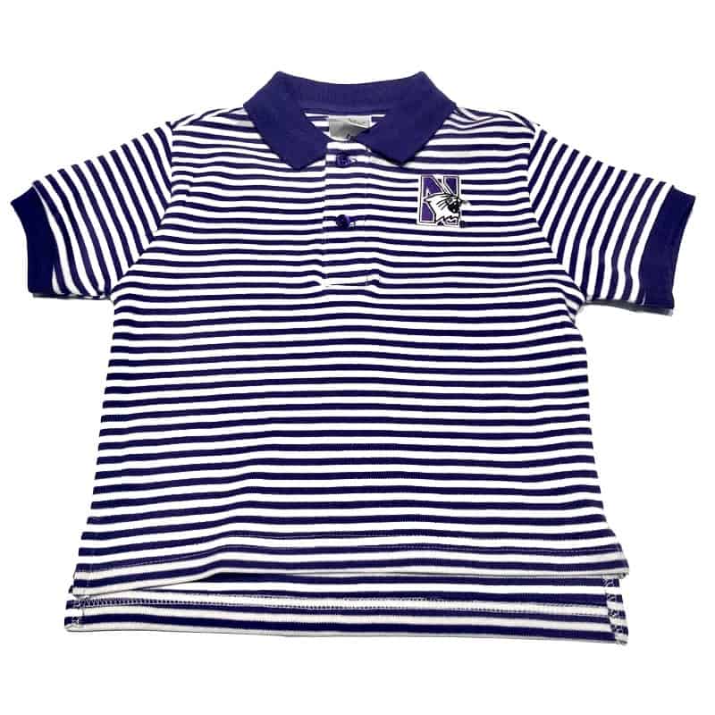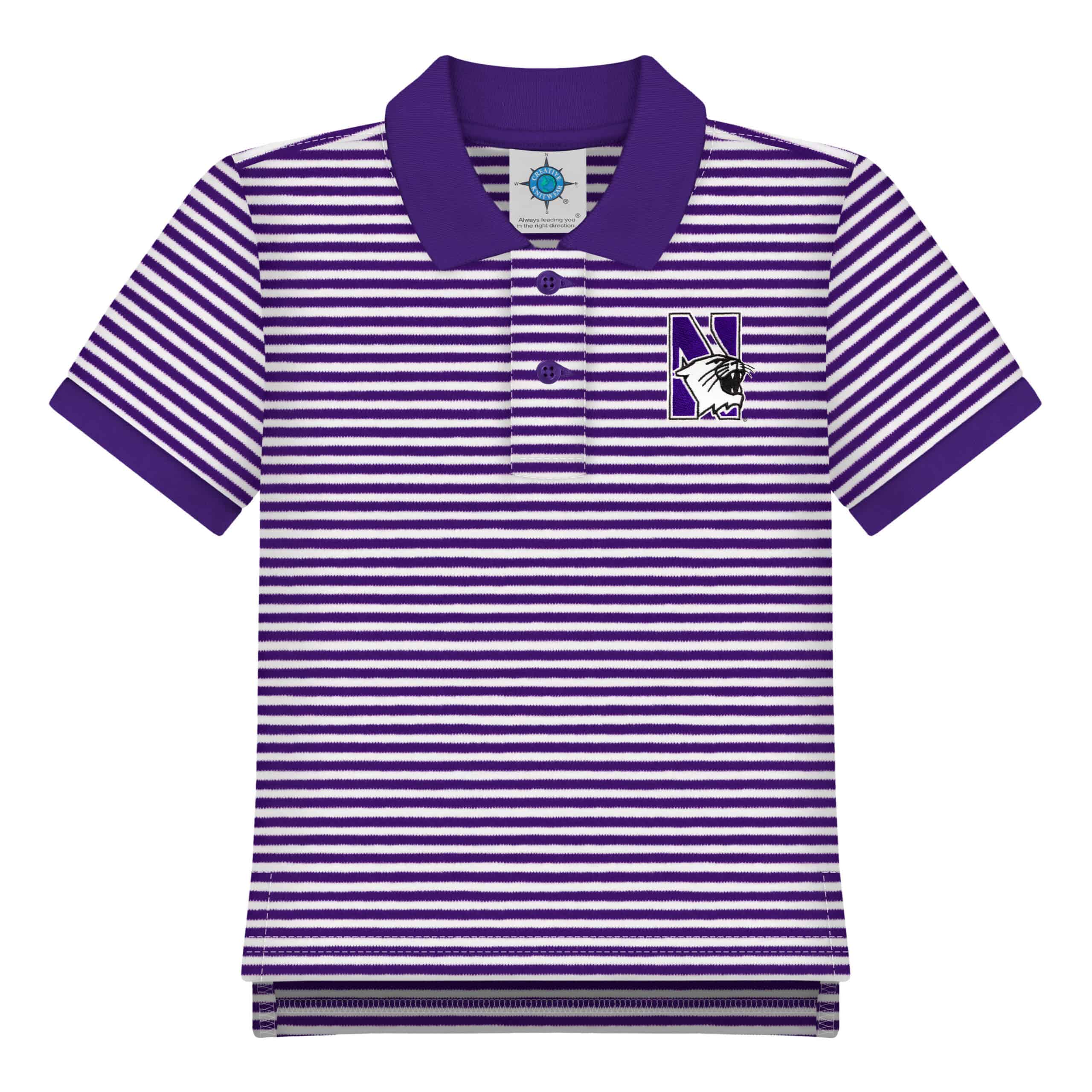 Northwestern University Wildcats Purple & White Stripped Polo Shirt With Embroidered N-Cat Design