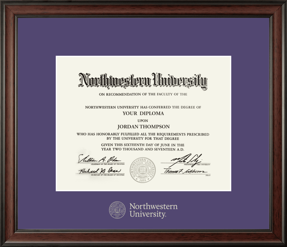 Northwestern University Wildcats Silver Embossed Diploma Frame in Studio with a purple mat quantity