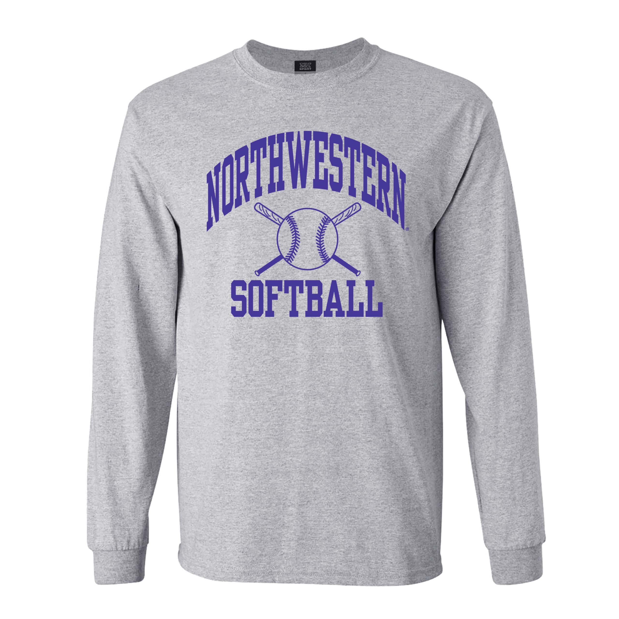 Northwestern University Wildcats Sport Grey Long Sleeve Tee Shirt with Softball Design