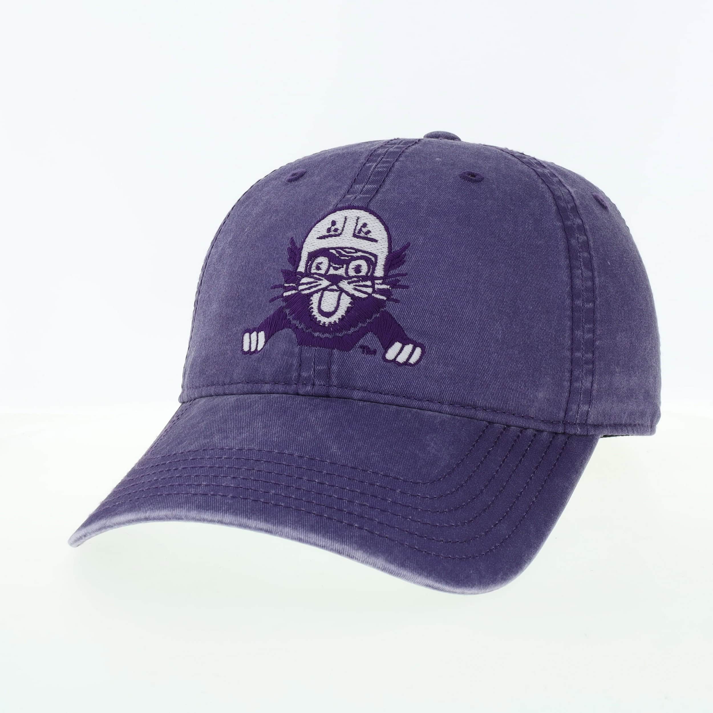 Northwestern University Wildcats Super Light Weight Legacy Unconstructed Adjustable Vintage Washed Purple Terra Twill Hat with Vintage Cat with Helmet Design