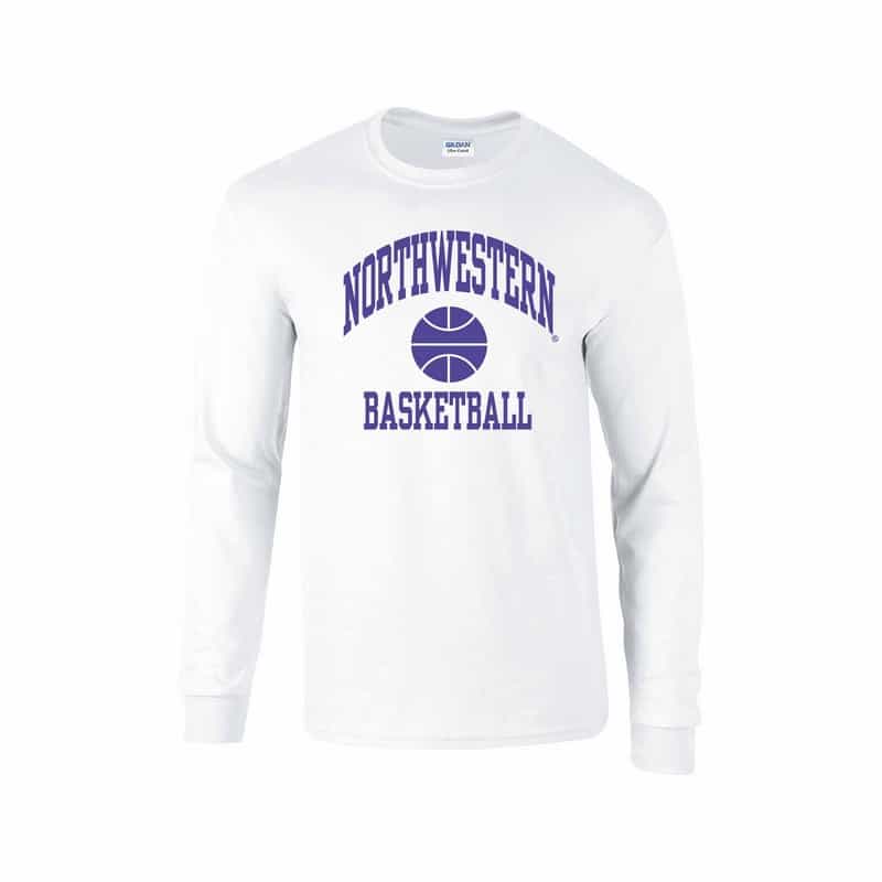 Northwestern University Wildcats White Long Sleeve Tee Shirt with Basketball Design