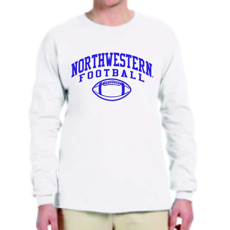 Northwestern University Wildcats White Long Sleeve Tee Shirt with Northwestern Football Design