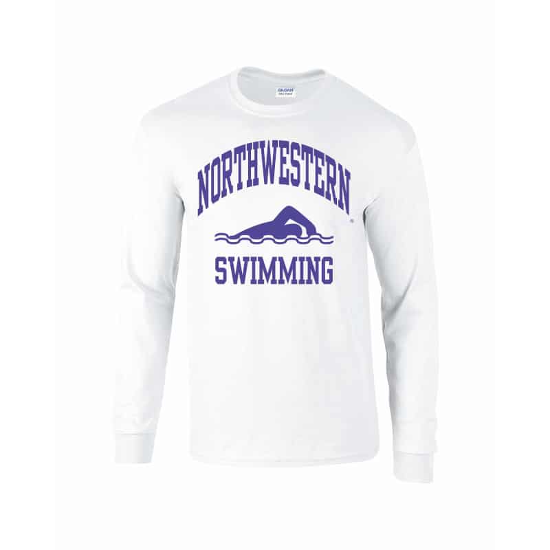 Northwestern University Wildcats White Long Sleeve Tee Shirt with Swimming Design