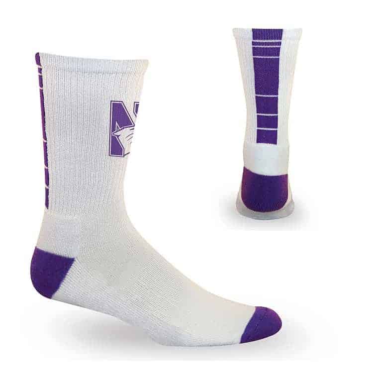 Northwestern University Wildcats White/Purple Half Cushion Crew Socks with Arch Support and N-Cat Design