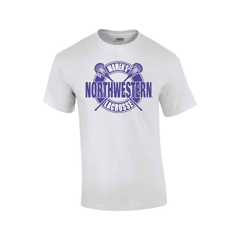 Northwestern University Wildcats White Short Sleeve Tee Shirt with Women’s Lacrosse Design