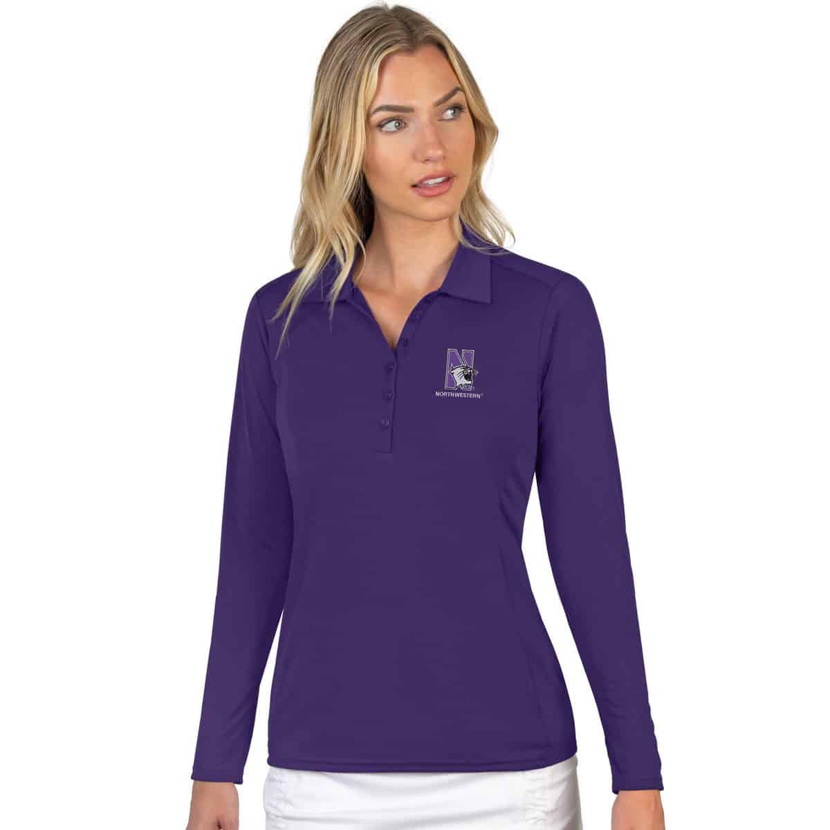 Northwestern University Wildcats Women’s Antigua Purple L/S Tribute Polo Shirt with N-Cat Design