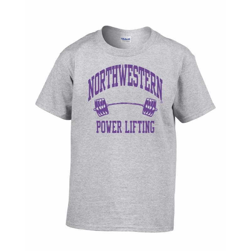 Northwestern University Wildcats Sports Grey Short Sleeve Tee Shirt with Power Lifting Design