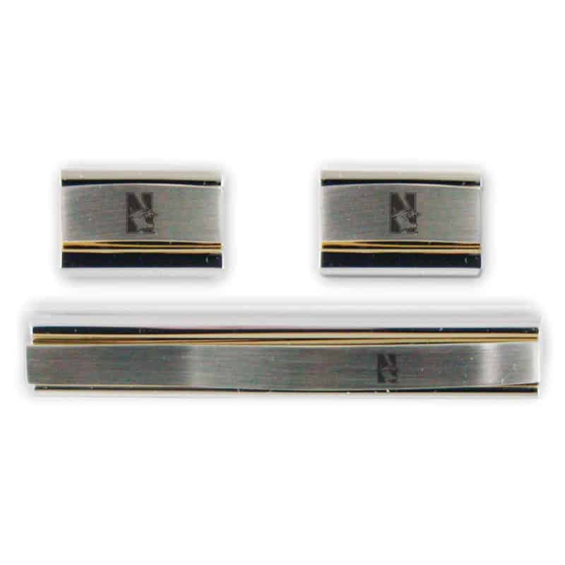 Northwestern University Wildcats Laser Engraved Gold/Silver Cufflink & Tie Bar Set with Mascot Design