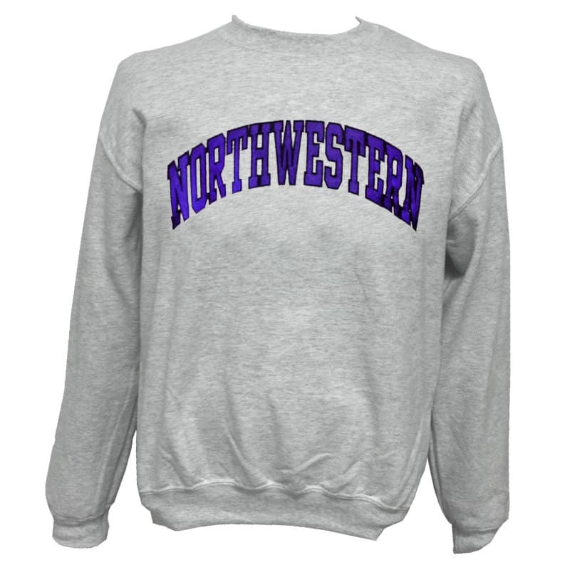 Northwestern University Wildcats Light Grey Crewneck Sweatshirt with Full Chest Embroidered Northwestern Design