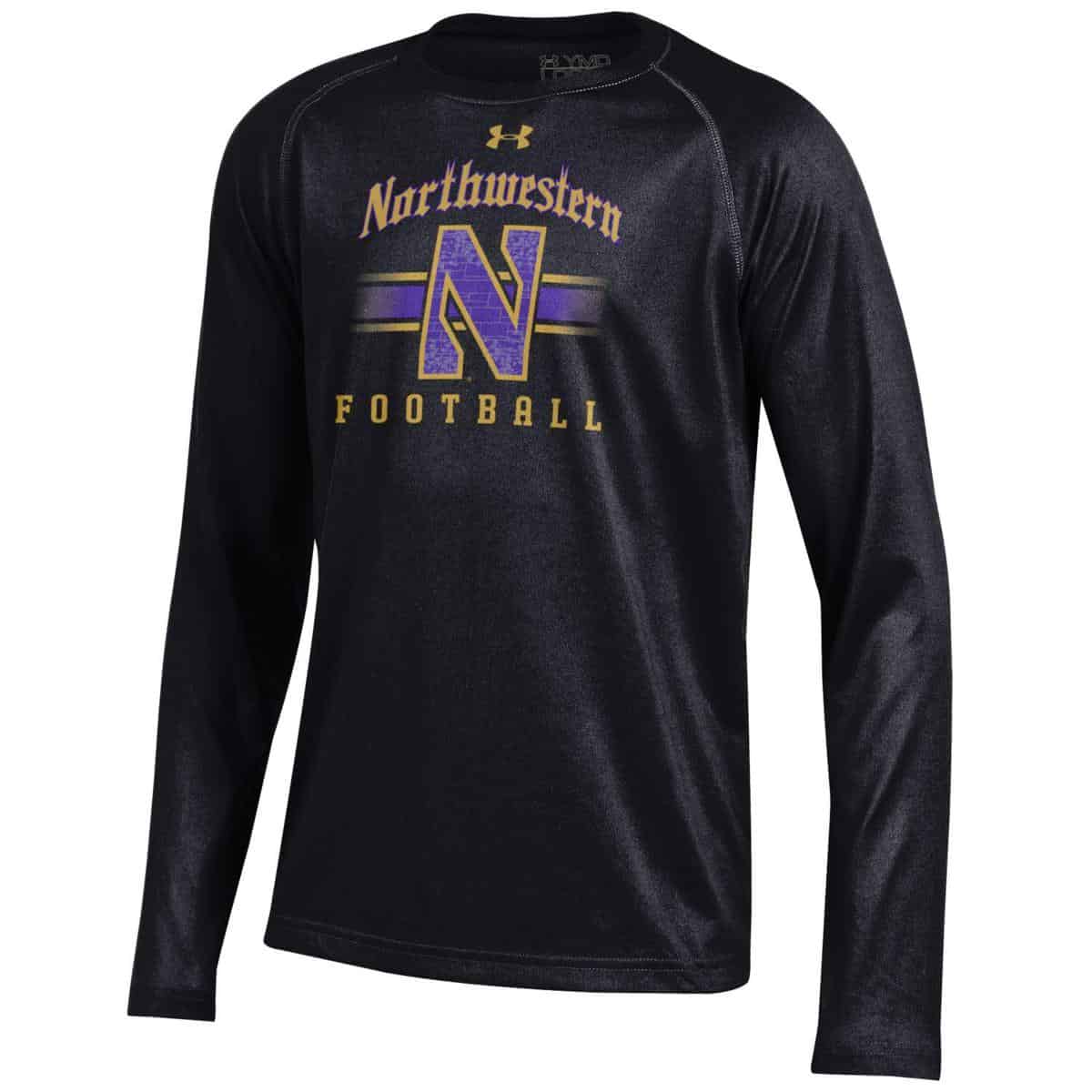 Northwestern University Wildcats Men’s Under Armour Tactical Tech™ Black Long Sleeve T-Shirt with Northwestern Football & Stylized N Gothic Design