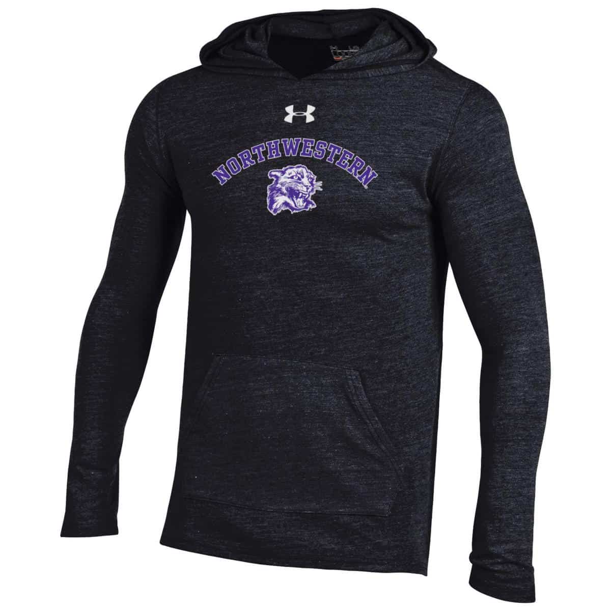 Northwestern University Wildcats Men’s Under Armour Triblend Black Heather Hooded Long Sleeve Tee with Vintage N-Cat Design