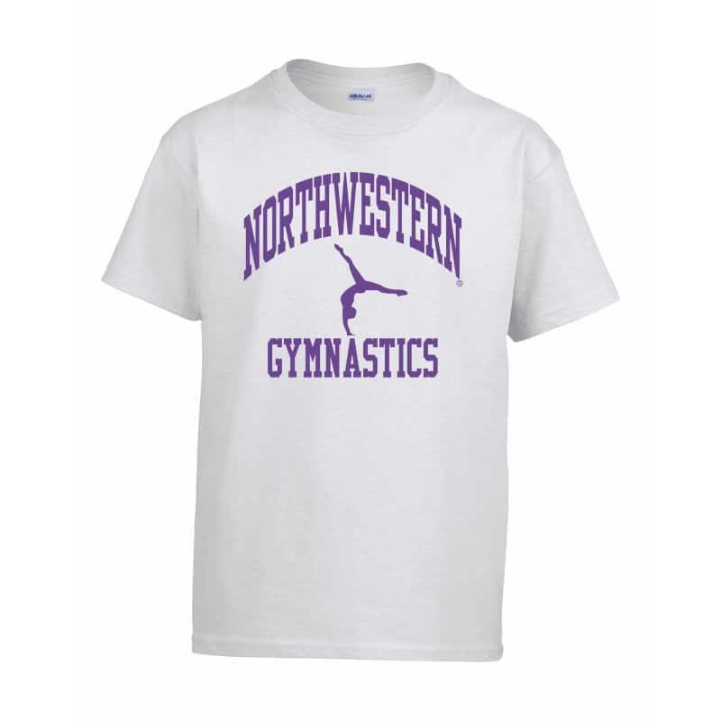 Northwestern University Wildcats White Short Sleeve Tee Shirt with Gymnastics Design