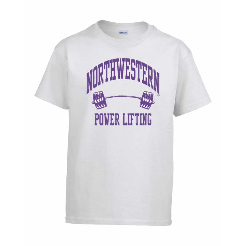 Northwestern University Wildcats White Short Sleeve Tee Shirt with Power Lifting Design