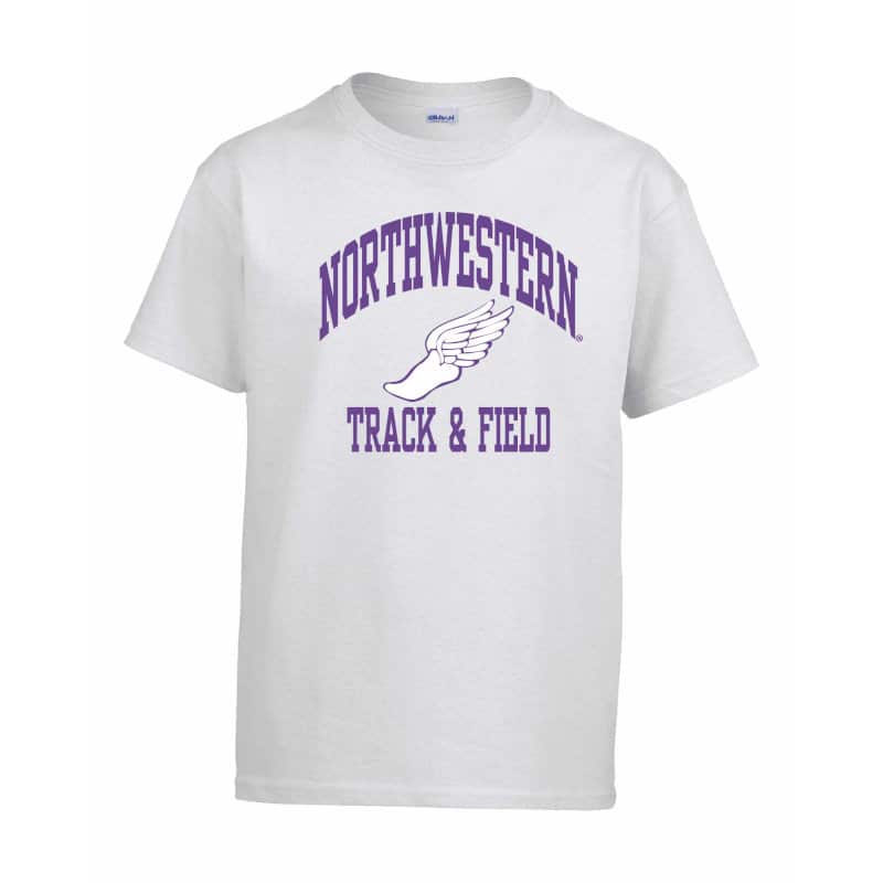 Northwestern University Wildcats White Short Sleeve Tee Shirt with Track & Field Design