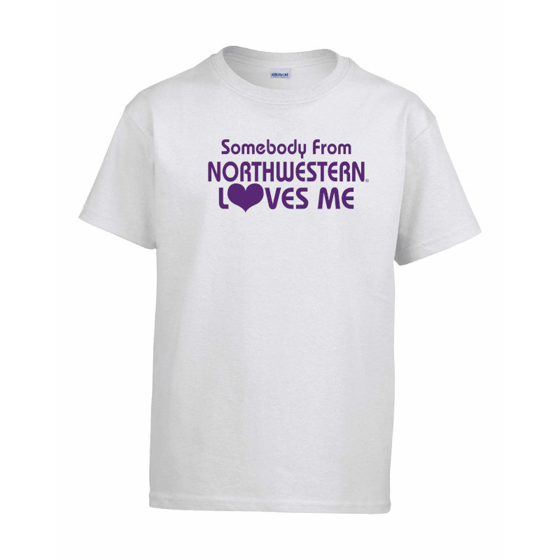 Northwestern University Wildcats Youth White Short Sleeve Tee Shirt with “Somebody From Northwestern Loves Me” Design